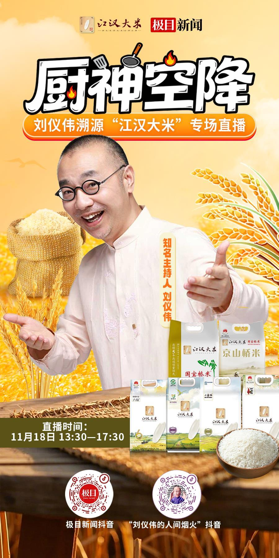 11月18日13:30—17:30,锁定极目新闻抖音号、刘仪伟的人间烟火抖音号,跟随“厨神”脚步,一起溯源“江汉大米”的品质之路,解锁更多美味吃法,把这份来自江汉平原的香甜与安心带回家!