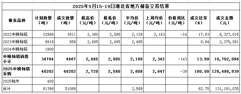 本周湖北地储成交各类粮油51069吨。其中销售:2022年中晚籼稻3911吨,成交率17.03%,成交均价2129元/吨,环比下跌14元/吨;2023年中晚籼稻956吨,成交率9.64%,成交均价2485元/吨。采购:2025年中晚籼稻46202吨,成交率100%,成交均价2608元/吨,环比下跌39元/吨。