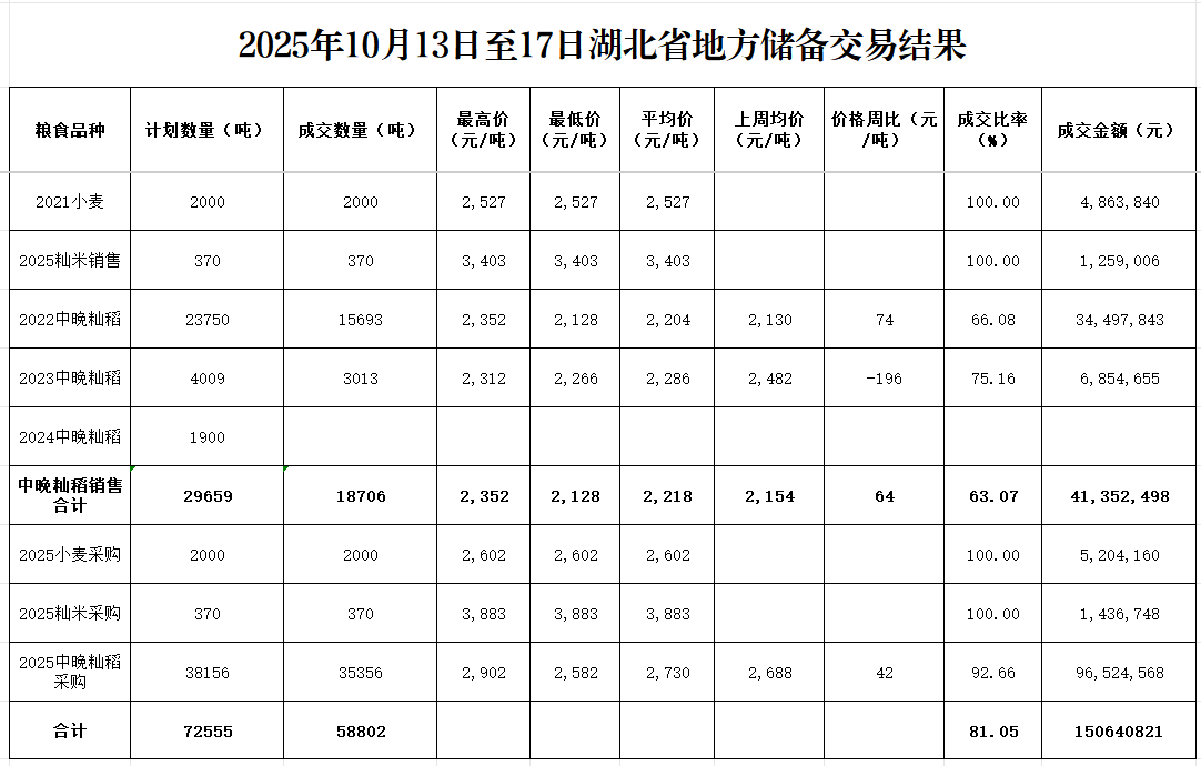 本周(2025年10月13日—10月17日)湖北无国家政策性粮食投放。