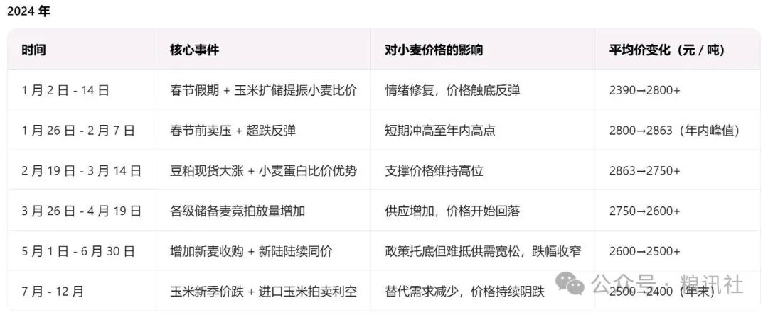 2024 年的小麦市场,被 “丰产 弱需求” 的基本面牢牢绑定:开年首月,“春节前卖压释放” 叠加 “玉米扩储提振小麦比价”,价格从 2390 元 / 吨快速反弹至 2863 元 / 吨的年内高点,看似市场情绪回暖,实则是超跌后的短暂修复。